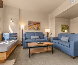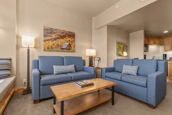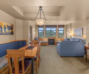 This condominium features two separate bedrooms with first bedroom having 1 king and the second bedroom with 1 queen bed. They adjoin to a fully equipped kitchen, dining area and living area with a queen-size pull-out sofa sleeper and gas fireplace. The unit features two standard bathrooms. The condo includes a flat screen television in the living area, flat screen television in the bedrooms, humidifiers, in-room safe, coffee makers, hair dryers, and steamer. Approximately 1100 square feet. Recommended maximum occupancy is 6.