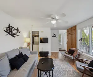 This cozy space sleeps up to four guests, featuring a queen bed in the master bedroom and a pullout couch in the living room.