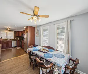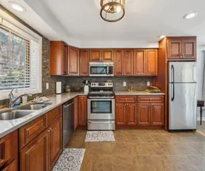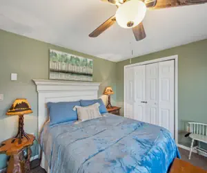 The unit features a 55” mounted Roku Smart TV, providing access to YouTube TV and allowing guests to log into their Netflix, Disney+, Amazon Prime, and other streaming accounts. The fully stocked kitchen is perfect for home-cooked meals, complete with pots, pans, a toaster, waffle maker, griddle, and a Keurig coffee maker that offers both pod and ground coffee options. Plus, the clubhouse pool and sauna are just a short walk away.