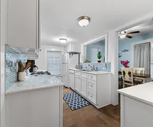 The recently renovated kitchen is a highlight of the home. Designed with both charm and practicality in mind, it features a gas range, modern tilework, and plenty of counter space for prepping meals. The fresh cabinetry and open layout make it an enjoyable space to cook, snack, or gather for coffee and conversation. Whether you're preparing a casual breakfast or a family dinner, this kitchen has everything you need to feel at home.