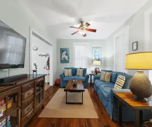 With two bedrooms and one full bath, the home comfortably accommodates up to four guests in beds. The layout is cozy and functional, with an open, light-filled living space and thoughtful touches throughout. Original hardwood floors and classic details give the home its vintage charm, while updated amenities ensure your stay is both comfortable and convenient.
