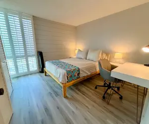 Private master bedroom features queen size bed (sleeps 2), bedside tables, work desk & chair, closet, and tower fan. Second private bedroom features 2 twin size beds (sleeps 1 each, 2 total), closet, and tower fan. Full bath includes single sink vanity, toilet, and subway tile shower.