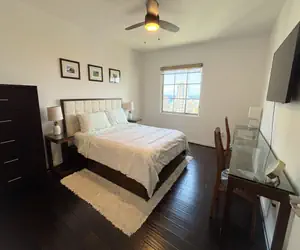 Master bedroom features a queen size bed (sleeps two), two bedside tables and lamps, two closets with mirrored sliding doors, dresser, two vanity/work tables with chairs, and flatscreen TV.