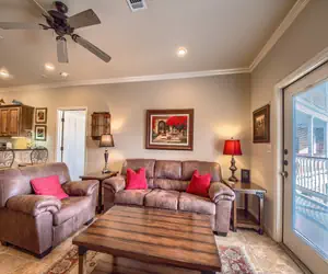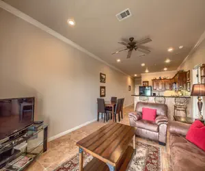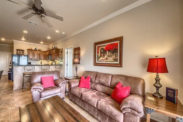 This 3 bedroom/2-bathroom unit sleeps 8 guests. It has a King in the Master bedroom, Queen in the second bedroom, Queen bed in the 3rd bedroom, and a Queen-size sofa sleeper in the living room! The master has a private bathroom, and the guest bathroom is in the hallway conveniently located right across from the 2nd and 3rd bedroom. High quality linens are provided for all beds and bathrooms. You'll feel right at home in the cozy living room and gorgeous kitchen equipped with all your appliances and utensils! Spend lazy afternoons enjoying your peek-a-boo view of the Guadalupe River from the balcony.
