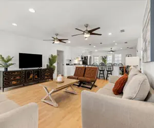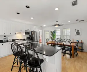 Inside, you'll find a bright, open-concept living space with a tasteful coastal design that makes relaxing easy. The spacious common area includes a cozy living room, dining table for shared meals, and a fully equipped kitchen with stainless steel appliances and a floating island with bar seating. A dedicated laundry room is just off the common space for added convenience.