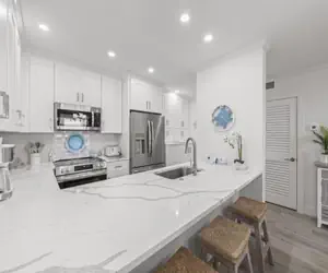 Step into a world of coastal elegance in this stunning, no-detail-overlooked Gulf-front condo on beautiful Sanibel Island. From the moment you walk in, you'll be captivated by the bright, open-concept living space featuring a gourmet kitchen with white granite countertops, custom cabinetry, and top-of-the-line stainless steel appliances. The kitchen seamlessly flows into the dining and living areas, all framed by breathtaking views of the beach and the Gulf of Mexico. Gather around the stylish chandelier-lit dining table for six, or relax in the comfortable living room with plush seating and a large flat-screen TV—perfect for movie nights after a sun-soaked day.