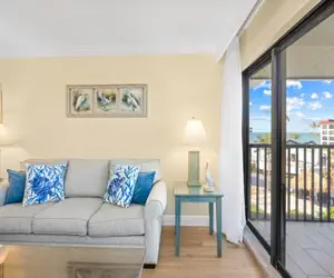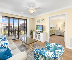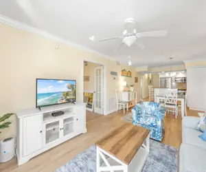 Located on the third floor, our condo boasts breathtaking views of the endless beach, the shimmering Gulf waters, and the lush tropical landscape surrounding the property. Watch the sun glisten over the lagoon in the afternoon, or simply enjoy the serenity of the gentle sea breeze from your private balcony. On cooler days, the warm Florida sun pours in, creating the perfect cozy haven, while on warmer days, six ceiling fans provide a refreshing escape.