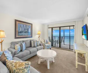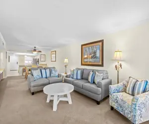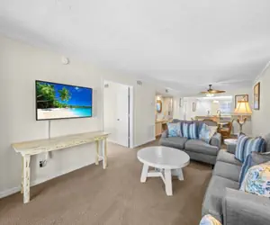 Inside, the condo offers a spacious and open layout filled with natural light. The living room is both comfortable and inviting, opening onto a screened lanai where you can relax in the shade while watching the waves roll in. The fully appointed kitchen includes a breakfast bar, and the adjacent dining room provides space for shared meals or quiet mornings with coffee.