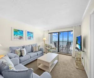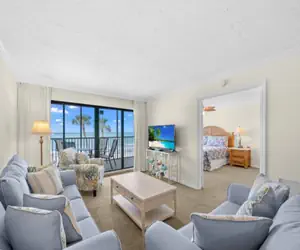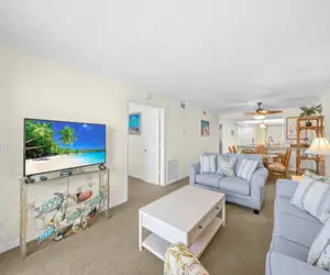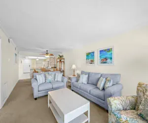 The living area flows easily into the full-size dining room and a well-appointed kitchen with a convenient breakfast bar. The primary bedroom and second bedroom include a king bed. A queen sleeper sofa in the living room provides additional sleeping space, allowing the condo to comfortably accommodate up to six guests.