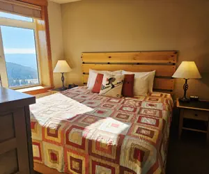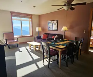 White Pine 412 is a two-bedroom two-bathroom ski-in ski-out unit located on the fourth floor of the White Pine building. This unit has a fully stocked kitchen and a table with seating for 6. The living room has a queen-size sleeper sofa, TV with DVD Player, gas burning fireplace, and access to the balcony with spectacular views of Lake Pend Oreille. The master bedroom features a king size bed and ensuite bathroom with a walk-in shower. The second bedroom has a captains bunk (twin over queen) and TV. The second bathroom features a single vanity sink and shower/tub combo. This unit has a private washer/dryer in the kitchen pantry. Unit has one assigned spot in a heated parking garage.The White Pine Lodge offers guests what they love, while being steps from the slopes! One, two, and three bedrooms units feature full kitchens, gas fireplaces, underground parking, ski storage, fitness facility, and 3 outdoor hot tubs.Schweitzer Property Management is the largest and most trusted property management company at Schweitzer. All guests with Schweitzer Property Management have access to the outdoor hot tubs and heated pool at the Selkirk Lodge.