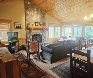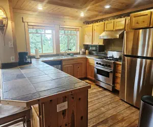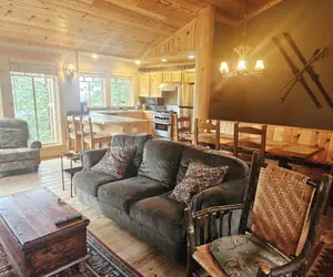 Cabin 1 at The Cabins is a beautiful, ski in/ski out, 3 bedroom/3 bathroom condo with a bonus 1 bedroom/1 bath apartment attached. Enter through one door and you'll find a cozy, upscale 3 bedroom cabin with a warm, inviting rock fireplace in a cozy living room with comfy seating for all. You'll also find a fully appointed gourmet kitchen, plenty of seating for family dining, a full bathroom and one bedroom with a queen bed. Down the stairs are two more bedrooms with full bathrooms off of each and a steam shower in the master bath. Enter the bonus studio apartment for a Queen bed, kitchenette and full bathroom. Enjoy a soak in your private hot tub after a day on the slopes. A covered parking spot and uncovered spot make it easy to park right at the front door and leave your cars for the weekend. This condo truly has it all.The Cabins are slope side community with rustic cabins between two and four bedrooms. These multi-level units feature a fully equipped kitchen, gas fireplace, washer and dryer, private hot tub, and parking for two vehicles. The community sits slope side to the Creekside lift, making ski access a breeze!