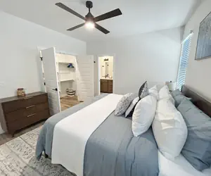 The primary suite offers a private refuge reminiscent of a commander's quarters, complete with a king-size bed, generous walk-in closet, and a spa-inspired en-suite bathroom featuring dual vanities and a walk-in shower with dual rainfall heads, a luxurious way to begin and end each day.