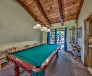 The Meadow Drive home features an open living room with soaring pine ceilings, a comfortable couch, and a flat screen TV. The soaring windows add natural light. Adjacent to the living room is a game room with a pool table. Off the game room is a large deck that runs the width of the home, the yard opens to trees and boulders to explore. The kitchen is well set up for chef preparing the family feast. Off the kitchen is a dining area that seats 10. The three gathering areas on the entry level make this a great family retreat. There is one bedroom and full bath on the entry level perfect for guests who don't like stairs. The living room and family room have gas fireplaces. New flooring in the family room and upstairs, new beds throughout in 2024.