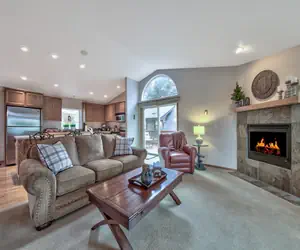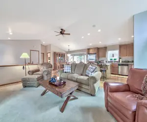 This home features upstairs living with a great room accented by a gas fireplace and open kitchen and dining area. There is plenty of room for the family to gather together. There is a deck with gas bbq immediately off the kitchen. The dining room table seats 6 and there are 4 stools at the breakfast bar. The kitchen features granite counters, stainless appliances and plenty of room for several chefs. The kitchen is fully equipped, all you need to bring is your food and drink, including 3 types of coffee makers, K cup, drip, Nespresso pod.
