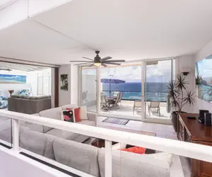 Discover oceanfront living at its finest in this two-bedroom, two-bath condo in Princeville, Kauai. With sweeping ocean views and AC in all rooms, this retreat offers tranquility and privacy.