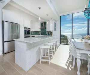 The living room features a stunning 98-inch television with a sound bar, creating an immersive viewing experience, along with a 60-inch fireplace that adds warmth and ambiance for cozy evenings. Each of the four bedrooms is equipped with a 75-inch TV, and above the bar, a handcrafted mosaic creates the illusion of looking into a vibrant aquarium, adding a truly unique and artistic touch to the space.