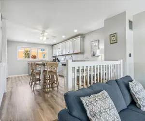 Step inside, and you'll find yourself in a sun-drenched living room that spills onto an oceanfront patio. Perfect for that morning coffee or evening sunset. A few steps up, the modern kitchen beckons with its inviting bar area, ideal for casual breakfasts or late-night snacks.