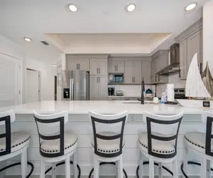 Inside, the spacious open-concept design is perfect for gathering. The dining table seats eight beneath a gorgeous chandelier, with five additional barstools at the breakfast bar. The kitchen is fully stocked with stainless steel appliances, a regular coffee pot and Keurig, and everything you need for cooking and entertaining. Adjacent to the kitchen, you’ll find a stylish bar area with a wine fridge, beverage fridge, ice maker, and plenty of glassware for your favorite drinks.