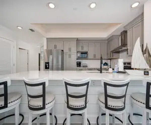 Inside, the spacious open-concept design is perfect for gathering. The dining table seats eight beneath a gorgeous chandelier, with five additional barstools at the breakfast bar. The kitchen is fully stocked with stainless steel appliances, a regular coffee pot and Keurig, and everything you need for cooking and entertaining. Adjacent to the kitchen, you’ll find a stylish bar area with a wine fridge, beverage fridge, ice maker, and plenty of glassware for your favorite drinks.