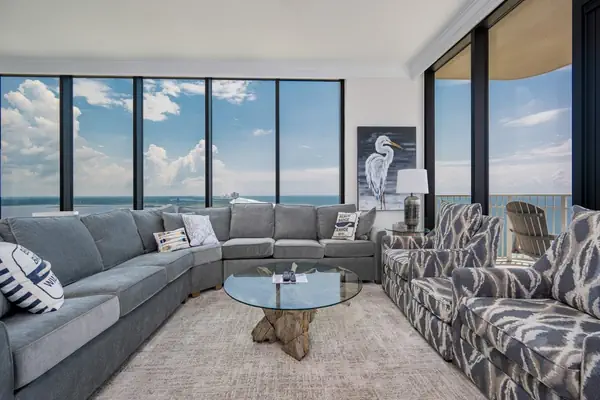 Welcome to Phoenix Gulf Shores II 2205, a stunning corner Gulf-front condo offering 270° views of the sparkling coastline. From this east-facing location, you can enjoy sweeping sunrises and sunsets that stretch for miles. Floor-to-ceiling windows in the living room, dining room, and master bedroom flood the space with natural light, while the private wrap-around balcony, furnished with comfortable poly-wood seating and a large table for dining or game nights, invites you to savor every moment outdoors.