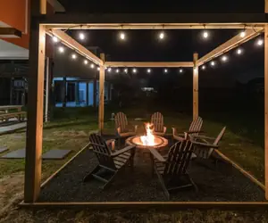 A custom firepit area with lighting and ample seating is located just behind the home and allows guests to enjoy the property during evenings or in the cooler months.