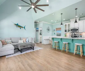 Sea Glass Retreat features an open concept kitchen, dining and living areas and here you will find everything you need, so just relax and enjoy. The kitchen has a custom banquette with ample seating and a large island with additional seating. The kitchen has everything needed to prepare meals but there are also many great restaurants nearby if you would rather dine out. The dual Keurig coffee maker works with K-Pods as well as traditional drip coffee. The kitchen also includes a margarita machine, so plan to make your favorite frozen drinks while you’re here! Step out on the amazing deck to enjoy the morning breeze with your coffee before heading off to the beach or to any of the many great activities available nearby.