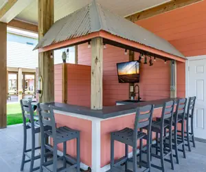 The downstairs area was designed with outdoor entertainment in mind. The custom bar area has ample seating for meals or to enjoy a cold beverage. It also features a sink, large countertops, a smart TV and LED lighting. An assortment of beach toys is provided underneath the bar, and cornhole boards and charcoal grill are also available.