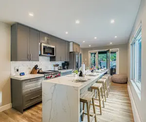 Step inside and be greeted by a spacious, open-concept living area designed for relaxation and connection. Large windows frame the scenic mountain landscape while a wood-burning fireplace adds a warm, rustic touch. The living room also features a full-size pool table, offering built-in entertainment right at the heart of the home. Whether you’re enjoying a game night or a cozy evening by the fire, this space invites connection and comfort.