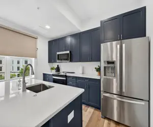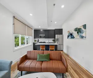 Wake up to sunlight streaming through large windows and enjoy your morning coffee while overlooking the square. The fully equipped kitchen has everything you need for a comfortable stay, whether you're cooking in or exploring one of the many restaurants just steps away.