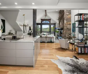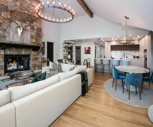 • The heart of this remarkable residence lies in its grand great room, where a magnificent stone fireplace anchors the space with warmth and character. Rich leather furnishings and warm wood accents create an atmosphere of refined mountain elegance, while the state-of-the-art kitchen, adorned with granite countertops and a convenient breakfast bar, beckons culinary enthusiasts to create memorable gatherings around the eight-person dining table.