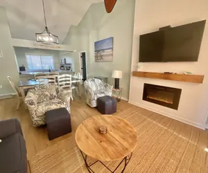 The primary bedroom features a king-sized bed, lovely modern furniture, a desk for those enjoying a working holiday, and an en-suite. The en-suite features double vanities and an updated jetted tub/shower combo with tile surround. The second bedroom features two beds—one queen and the other full. This bedroom also has an en-suite with a tub/shower combo. The third bedroom features a queen bed and has a futon too! This bedroom connects to the guest bath, which has a tub/shower combo.