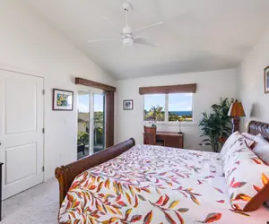 All three bedrooms are found upstairs. The master suite includes a luxurious bathroom with a walk-in tile and glass shower and a large bathtub. The two bedrooms with king and queen sized beds open to an ocean view lanai. The third bedroom offers two twin beds.