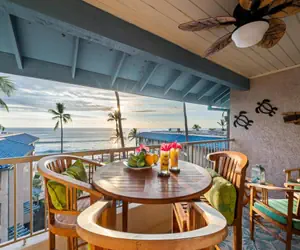 Indulge in the Hawaii resort experience from this luxury top floor unit that lies near the ocean at Kona Reef. Relax on your lanai watching for whales, dolphins and outrigger canoes as waves lap the rocky coast below.