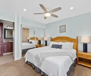 Master bedroom has a king bed and it's own bathroom. Guest bedroom has a queen bed. Queen sofa bed available in the living room.