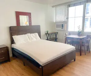 Living area offers a queen size bed (sleeps 2), closet, flatscreen tv, convertible work desk or dining table, and dresser with large windows for abundant natural light.