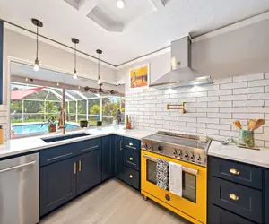 • Gourmet Kitchen – This home features a vibrant and fully renovated gourmet kitchen overlooking the outdoor patio and pool area with modern appliances and all the essentials you'll need for cooking at home. Perfect for the chef or culinary enthusiast. It has a large kitchen island with additional seating (and games) that opens up to the dining area with a cozy fireplace.