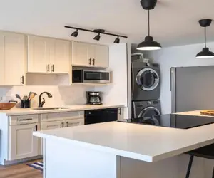 This home includes a full kitchen with a stove, oven, dishwasher, microwave, coffee pot, full fridge/freezer, dishes, cups, cutlery, basic cookware/bakeware, and rice cooker. Includes a stylish kitchen island/breakfast bar with seating for 2 guests.