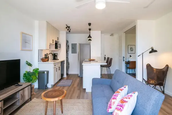 Our spacious living area offers a flatscreen tv, sofa, work desk, private standing lanai, and additional seating. In-unit washer and dyer are adjacent to kitchen.