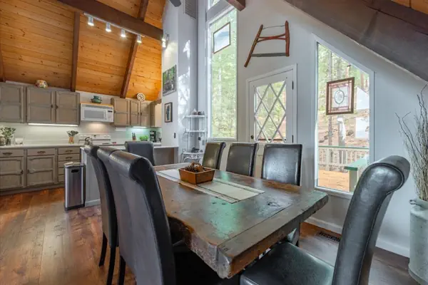 Adjacent to the kitchen, the dining area showcases a stunning natural wood farmhouse table that comfortably seats eight, perfect for gatherings with family and friends. The living area is designed for relaxation, featuring a cozy bar with two stools, a pair of swivel chairs, and a brand new sectional couch that invites you to unwind by the wood-burning fireplace. Expansive windows frame breathtaking views of Martis Valley, filling the space with natural light. For entertainment, a flat-screen TV with streaming apps, along with a charming table and a set of four chairs, creates the perfect setting for memorable game or puzzle nights by the fireplace.