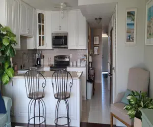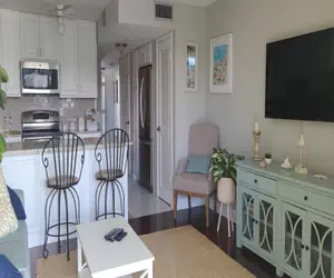 This condo has an updated kitchen and bathroom and beautifully decorated. Directly across the street from the beach and walking distance to shops and restaurants. Complex has great amenities of community pool, hot tub, tennis courts, pickle ball, shuffle board, and clubhouse with pool table, games, ping pong table, and books. Unit does not have washer and dryer but complex have many laundry facilities. Wifi and cable available. Laundry on the premises. 2 cars are able to park here.