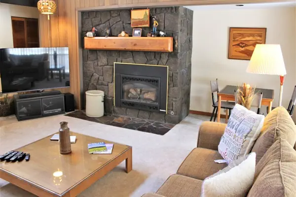 One level condo with bikes and gas BBQ for your outdoor enjoyment. The kitchen has upgraded stainless steel appliances. Off the dining area is a private Patio with gas BBQ and outdoor dining. The back deck looks over a common area and the Meadows Golf Course. Just recently added a new 65” Smart LG TV in the living room and all of the rooms are now equipped with Smart TV's. Kick your feet up in front of the stone-faced fireplace and watch your favorite show.
