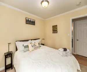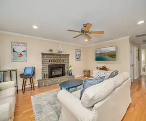 Inside, you’ll find a warm and welcoming living room featuring a gas fireplace and flat-screen TV, ideal for cozy evenings after a day of exploring. The cabin is tastefully decorated, offering a relaxing lake atmosphere throughout.
