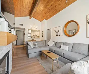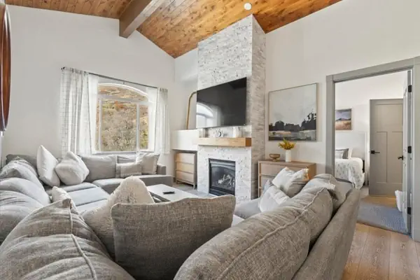 2 Bedroom Villa (Sleeps 6): Enjoy a spacious living room with a stunning wood ceiling, fireplace, Smart TV, and large luxury sofa; full kitchen with breakfast nook and dining area; primary suite with king bed, balcony/patio, jetted tub, walk-in shower, and dual vanities; second bedroom with two queen beds, TV, desk, and private full bath. Relax and take in serene mountain views from this remodeled villa designed for both comfort and connection.