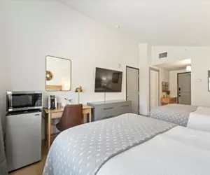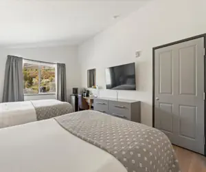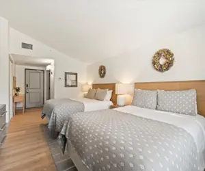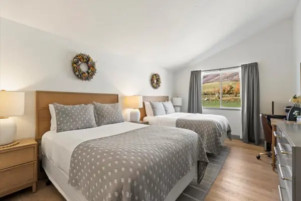 Double Queen Villa (Sleeps 4): Includes two queen beds, TV, desk, mini fridge, microwave, and private full bath. Relax and take in serene mountain views from this remodeled villa designed for both comfort and connection.