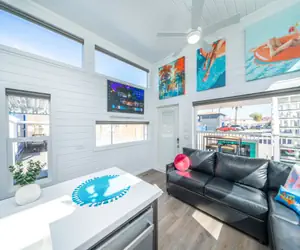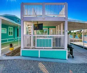 Nestled within the serene Beach Bungalows of Roadrunner Resort, 'Sandy Cheeks', Space #4, offers a tranquil retreat where coastal charm meets modern comfort. This uniquely designed 2-bedroom, 2-bathroom bungalow accommodates up to 6 guests, featuring two queen-size beds and a cozy pull-out sofa bed.