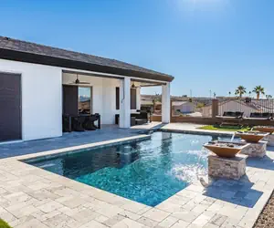 Welcome to this south side desert oasis where NOTHING is left to be desired. This beautifully furnished 3 bedroom, 3 bath home has everything you may want or need for your next vacation! At this home you and yours can relax like Royalty, enjoy your vacation and swim in your own private pool! Winter guests can relax in the Hot Tub (as it is too hot in summer, hot tub not available)! The common area is open with a big screen smart TV, kitchen island bar and it's own dining area. Great for gatherings and being together! Double car garage and RV garage and lots of other parking in driveway, ROOM FOR ALL YOUR TOYS. You'll be back planning your next vacation here again and again!