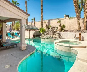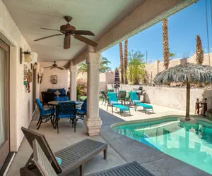 This beautiful 5 bedroom, 3 bath home is fully equipped for an amazing vacation for the whole family! There is an awesome Casita which offers extra priviacy and space. This home has a sparkling nartual gas heatable pool and spa, that at one end is 8 foot deep and has seating and table at the other end. Outside has lots of space to relax, BBQ, watch tv or play a game of corn hole what ever tickels your fansy. Insinde the home there is king bed in the master, queen bed in bedroom 2, bunkbed with queen on bottom and single on top in bedroom 3 and 4, and a queen in the casita. This house is centrally/south located by the london bridge golf course, it is perfect for entertaining large groups!
