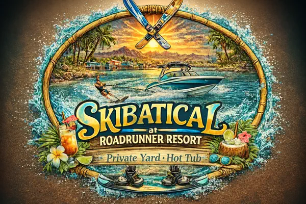 Escape to the Colorado River and take a "Skibatical"—a retreat where adventure and relaxation go hand in hand. This spacious 2-bedroom, 2-bathroom bungalow comfortably accommodates up to 8 guests, featuring two queen-size beds and two cozy pull-out sofa beds—perfect for watersports enthusiasts, families, and friends looking to soak up the sun and riverfront fun.