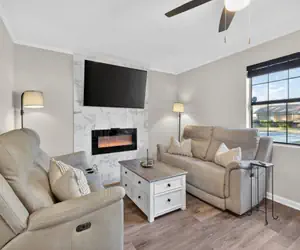 Relax in the bright, open living room featuring cozy seating, a large smart TV, and modern décor — perfect for movie nights or lazy afternoons.
