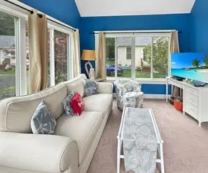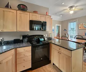 The Coral Retreat features a spacious master bedroom with a luxurious king-sized bed, ensuring a restful night's sleep. The second bedroom features a unique bunk bed setup: a twin on top and a full on the bottom, plus a trundle pullout under the bunk bed (with a full mattress), perfect for kids or extra guests. With a maximum capacity of five, this condo is designed to accommodate your needs comfortably. Step into the inviting living area, where a cozy couch doubles as a pullout queen bed, providing additional sleeping space if needed. The open layout creates a warm ambiance, perfect for relaxing after a day of exploring. The kitchen is a chef's dream, complete with modern appliances including a refrigerator, microwave, dishwasher, and an electric stove with oven. Enjoy meals together at the dining table, or unwind in the cozy living room equipped with cable TV and high-speed Wi-Fi for your entertainment needs.